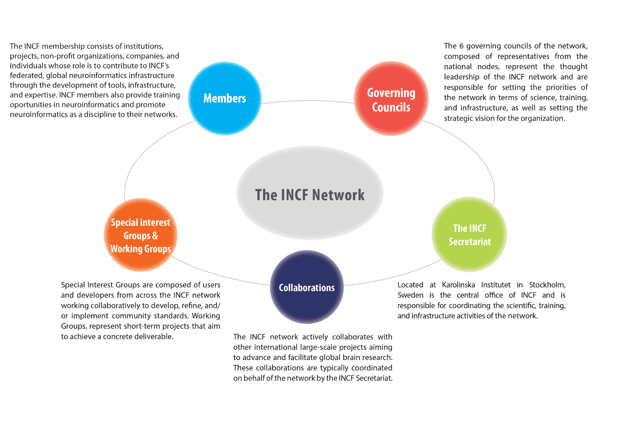 The INCF network comprises institutions, organizations, companies, and individuals active in neuroinformatics, neuroscience, data science, technology, and science policy and publishing.